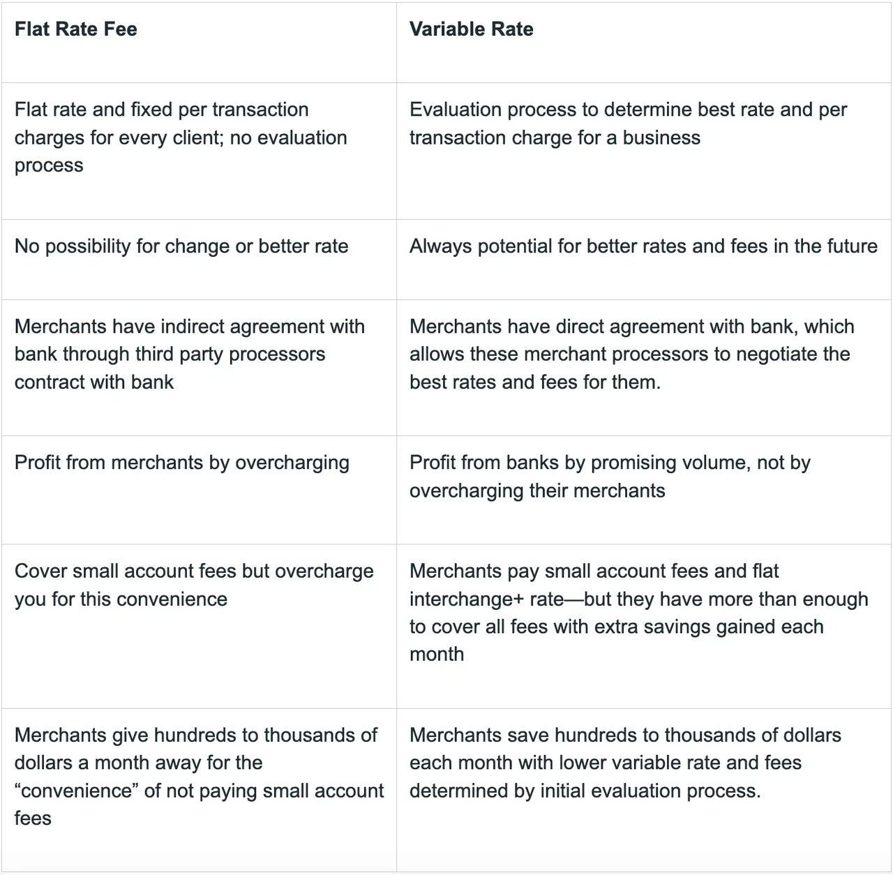 Businesses will have a direct agreement with the bank and undergo an evaluation process to determine the best rate, fees and technology for an individual business. It’s important to evaluate each business to find out things like what types of cards their customers usually use (for example American Express usually costs the merchant more than Visa) and what types of transactions occur (over the phone, online, in person). Again, a fixed rate is the same for every business everywhere. A variable rate is more specific to the business which helps the merchant obtain the best possible rates and fees on a monthly basis.